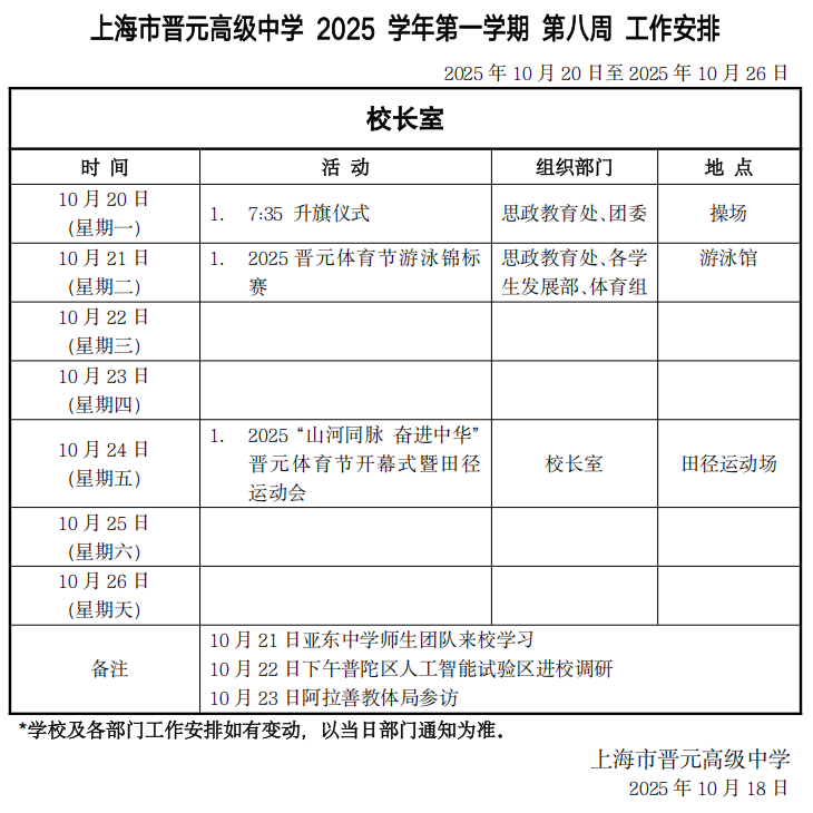 上海市晋元高级中学2025学年第一学期第八周工作安排