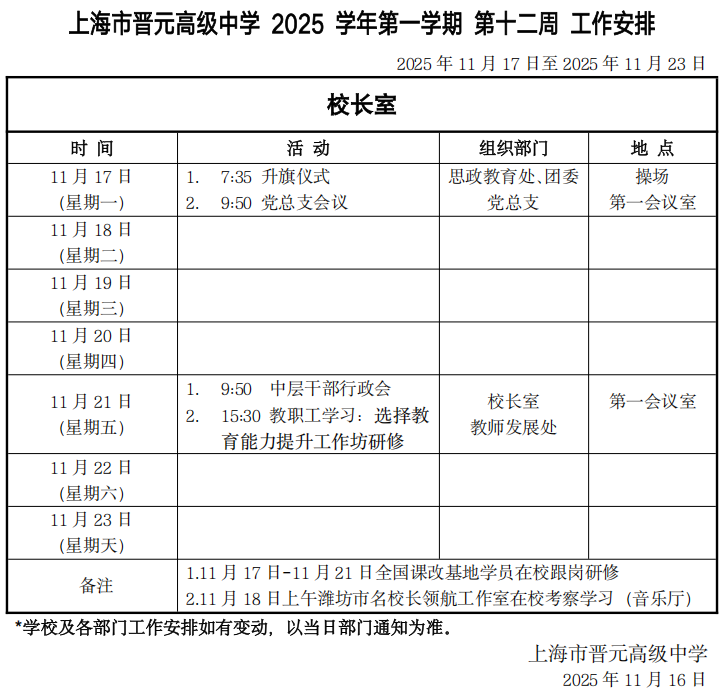 上海市晋元高级中学2025学年第一学期第十二周工作安排
