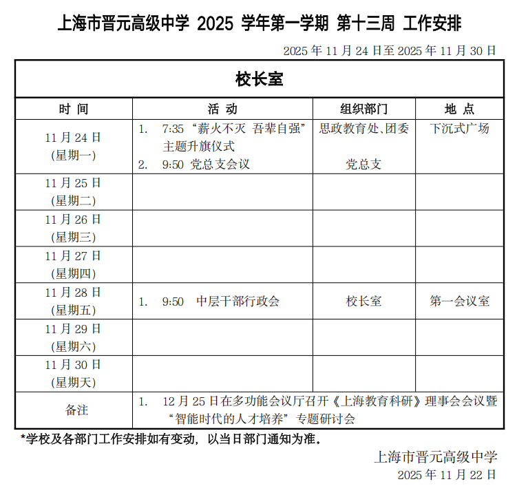 上海市晋元高级中学2025学年第一学期第十三周工作安排