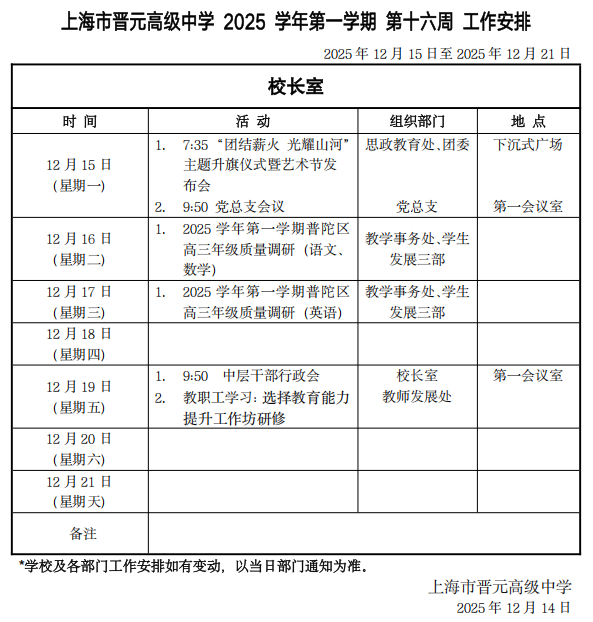 上海市晋元高级中学2025学年第一学期第十六周工作安排
