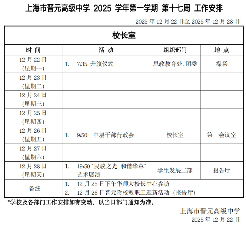上海市晋元高级中学2025学年第一学期第十七周工作安排