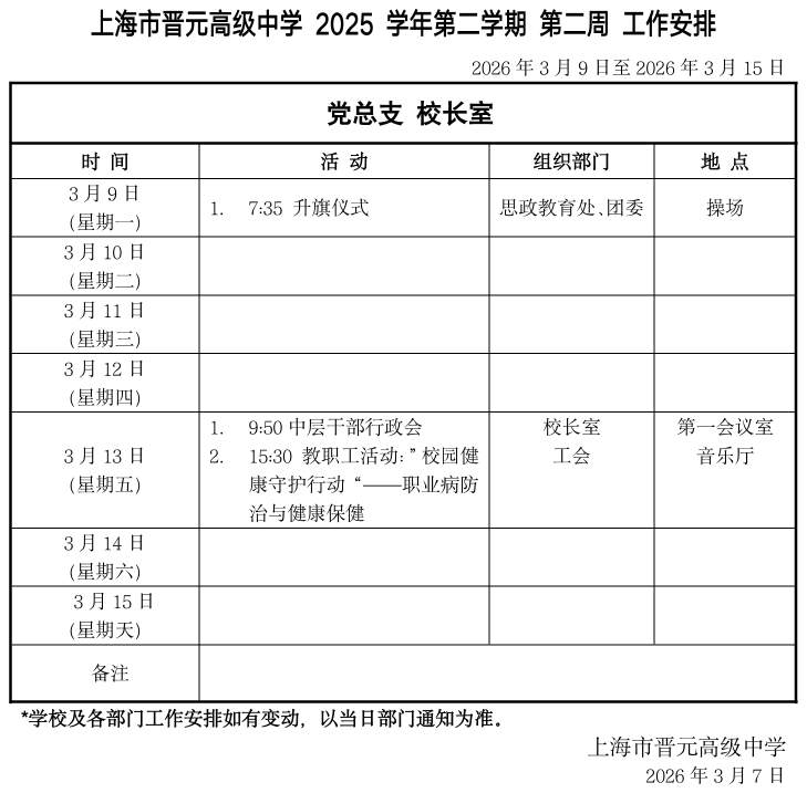 上海市晋元高级中学2025学年第二学期第二周工作安排