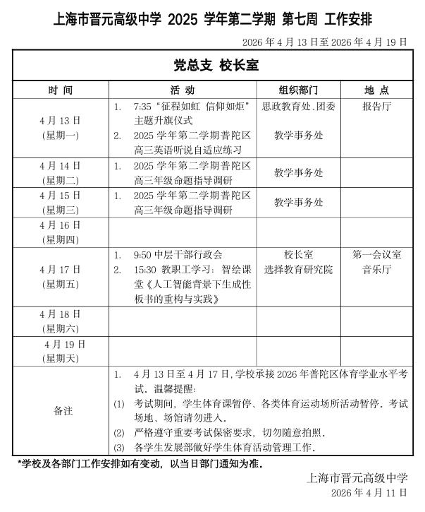 上海市晋元高级中学2025学年第二学期第七周工作安排