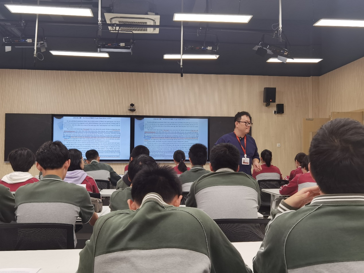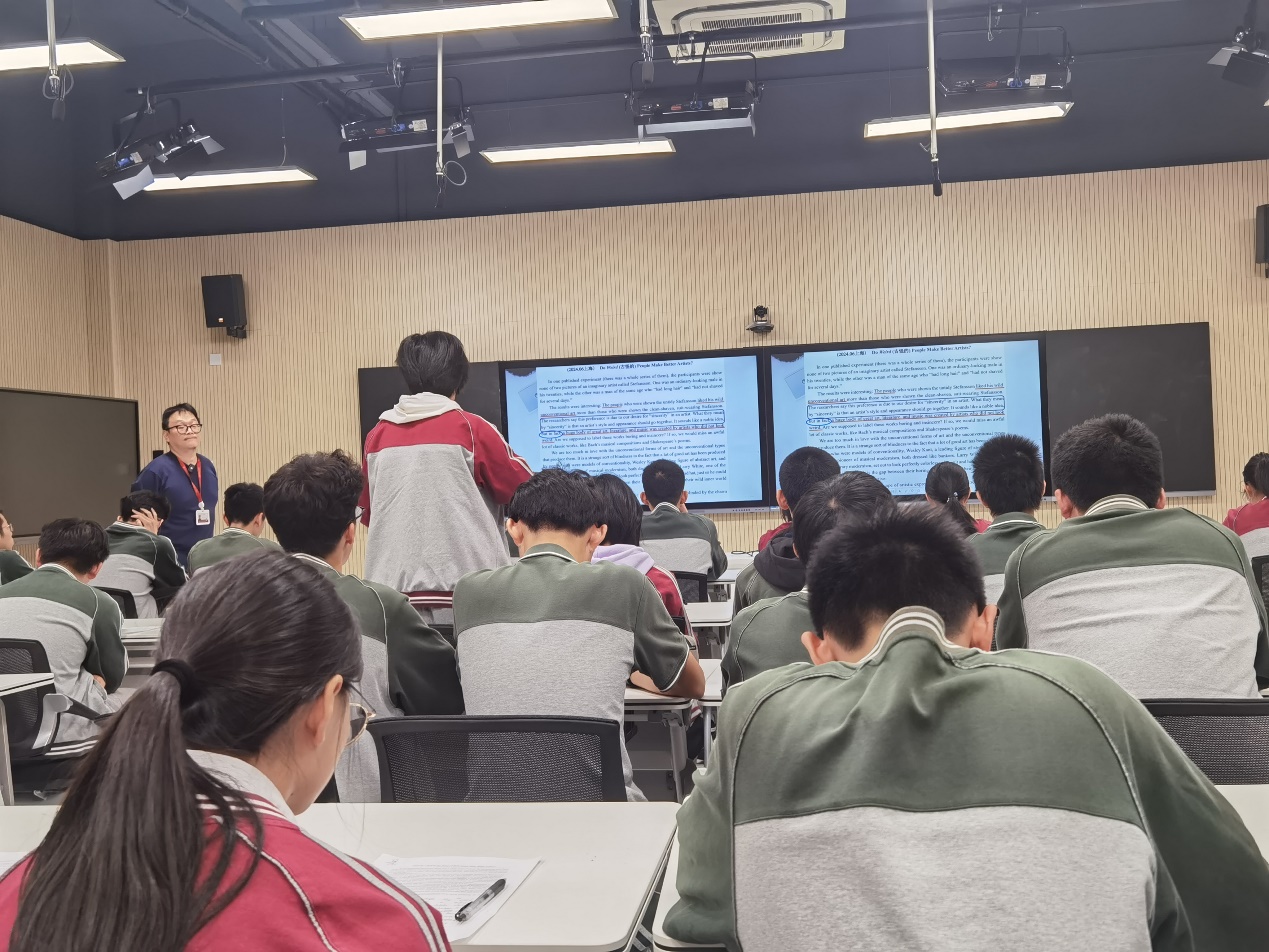 我校高三英语备课组组长陈梦夏老师以“基于主张与反主张语篇模式的概要写作”为题开展了课堂教学展示。陈梦夏老师基于课标和高考概要写作的评分要求,选取了两篇高考真题作为练习语篇。他认为,在高三概要写作教学中,学生常面临“读不懂”、“理不清”、“写不出”的问题,主要体现在无法识别文章的关键信息,撰写时逻辑不清。为解决这些问题,他将如何识别“主张与反主张语篇模式”中的语篇必要组成部分作为教学重点,使用思维导图工具将文章要点和结构可视化,帮助学生理清思路。同时,在概要写作的语言板块,他还借助AI智能修改的功能组织学生展开自评、互评,帮助学生逐步提升概要写作能力。通过这些环节,学生不仅能发现并改进自身写作中的问题,还能逐步把握同类型语篇的必要信息的提取路径,提升概要写作内容部分的得分率。